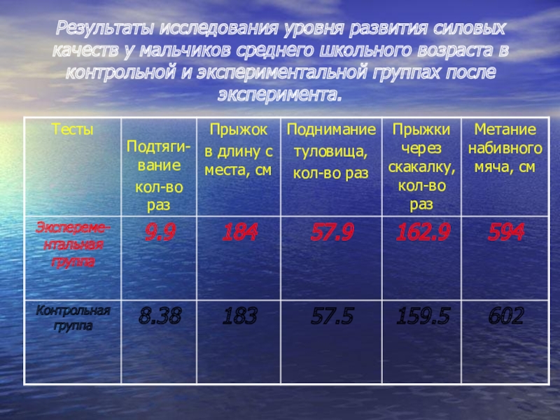 Слайд 10Результаты исследования уровня развития силовых качеств у мальчиков среднего школьного возраста