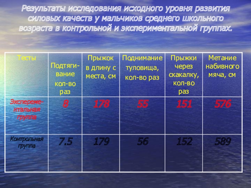 Слайд 8Результаты исследования исходного уровня развития силовых качеств у мальчиков среднего школьного