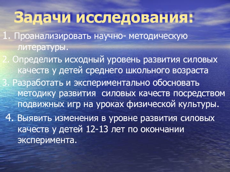 Задачи исследования:1. Проанализировать научно- методическую литературы.2. Определить исходный уровень развития силовых качеств у детей среднего школьного возраста3.
