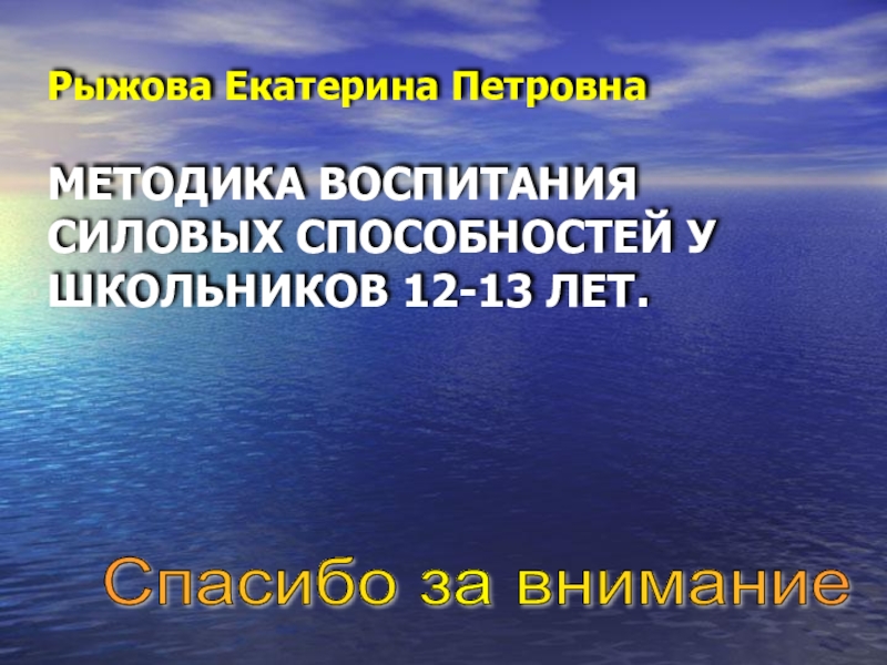 Спасибо за внимание Рыжова Екатерина Петровна   МЕТОДИКА ВОСПИТАНИЯ СИЛОВЫХ СПОСОБНОСТЕЙ У ШКОЛЬНИКОВ 12-13 ЛЕТ.