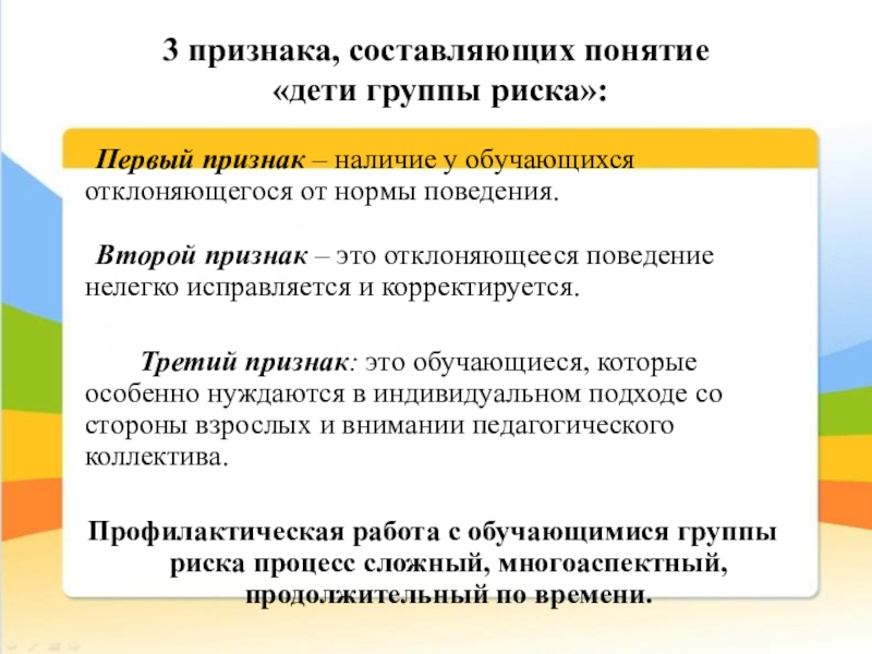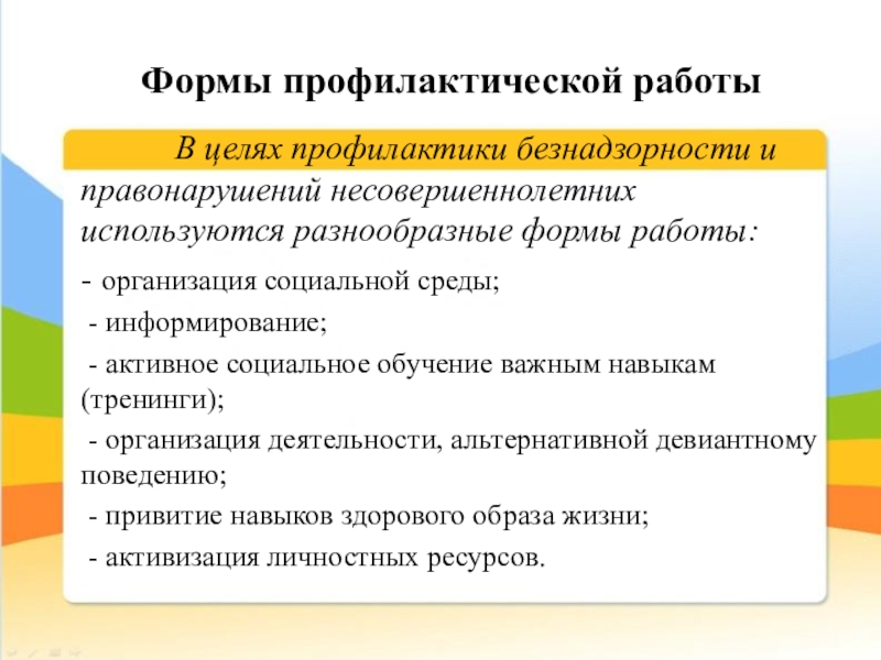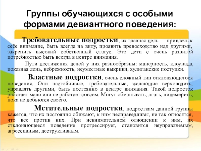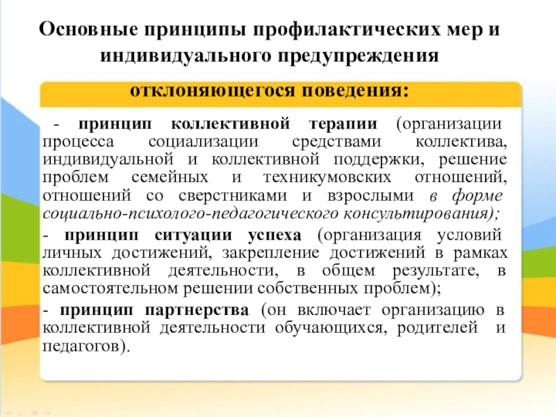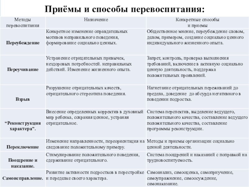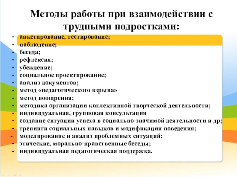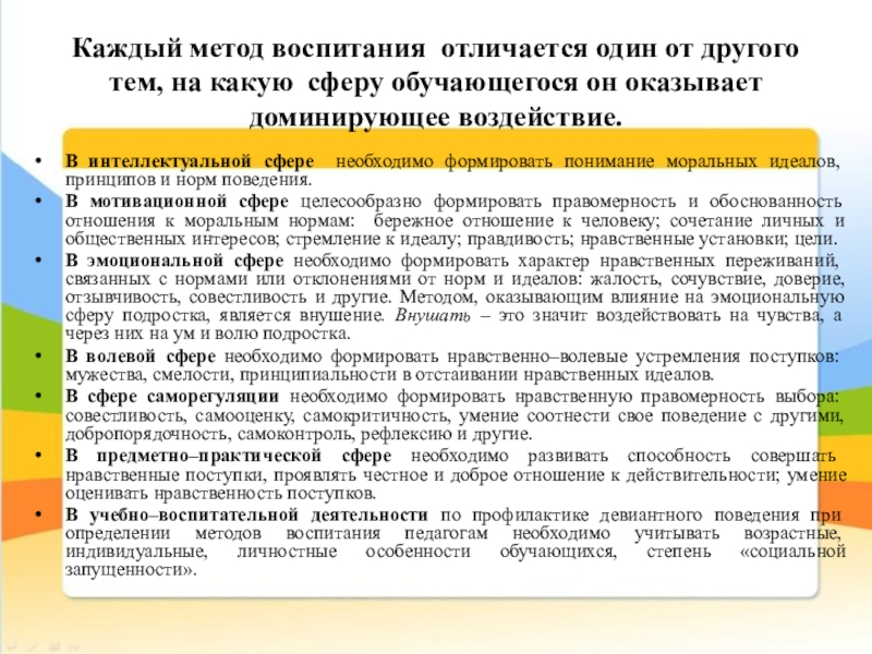 В учебно–воспитательной деятельности по профилактике девиантного поведения при определении методов воспитания педагогам необходимо учитывать возрастные, индивидуальные, личностные особенности обучающихся, степень «социальной запущенности».