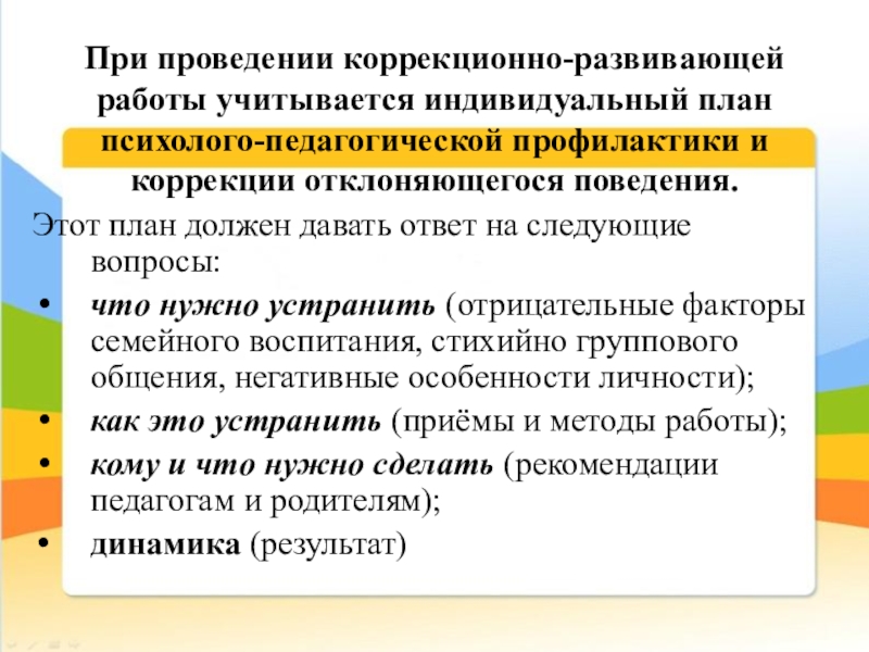 При проведении коррекционно-развивающей работы учитывается индивидуальный план психолого-педагогической профилактики и коррекции отклоняющегося поведения.