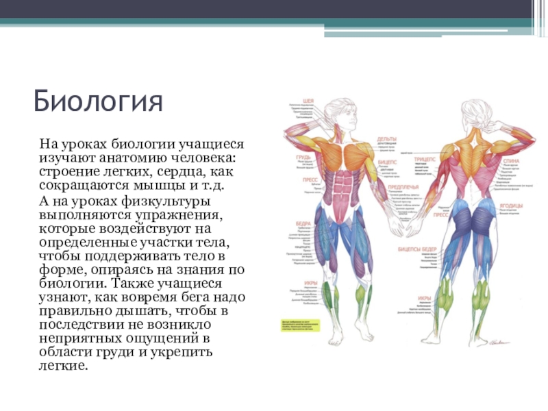А на уроках физкультуры выполняются упражнения, которые воздействуют на определенные участки тела, чтобы поддерживать тело в форме, опираясь на знания по биологии. Также учащиеся узнают, как вовремя бега надо правильно дышать, чтобы в последствии не возникло неприятных ощущений в области груди и укрепить легкие.
