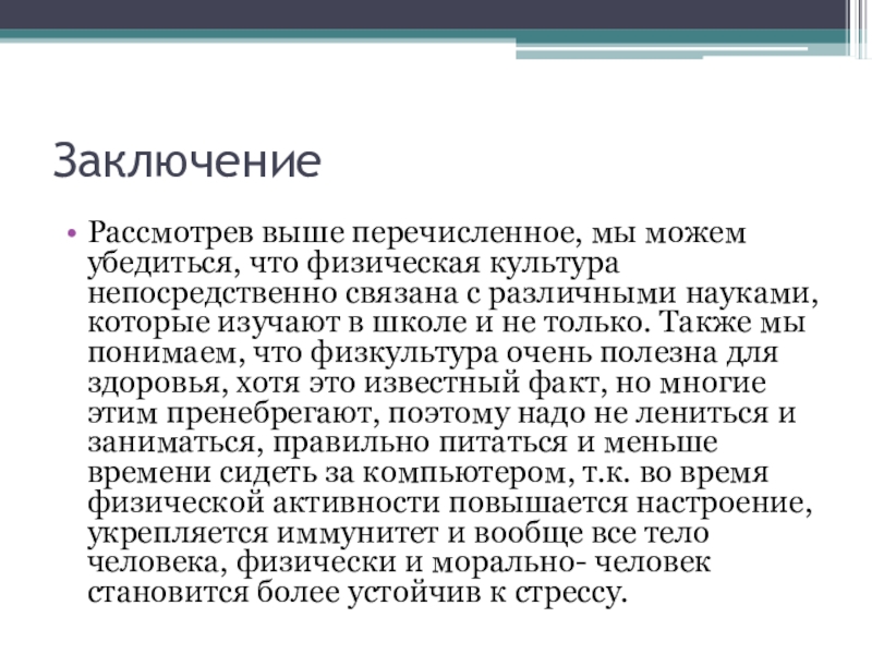 с различными науками, которые изучают в школе и не только. Также мы понимаем, что физкультура очень полезна для здоровья, хотя это известный факт, но многие этим пренебрегают, поэтому надо не лениться и заниматься, правильно питаться и меньше времени сидеть за компьютером, т.к. во время физической активности повышается настроение, укрепляется иммунитет и вообще все тело человека, физически и морально- человек становится более устойчив к стрессу.