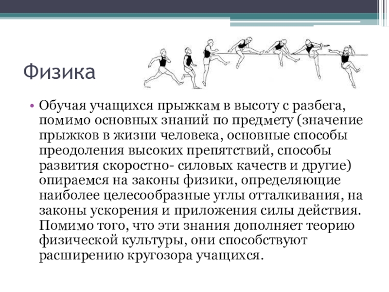 предмету (значение прыжков в жизни человека, основные способы преодоления высоких препятствий, способы развития скоростно- силовых качеств и другие) опираемся на законы физики, определяющие наиболее целесообразные углы отталкивания, на законы ускорения и приложения силы действия. Помимо того, что эти знания дополняет теорию физической культуры, они способствуют расширению кругозора учащихся.