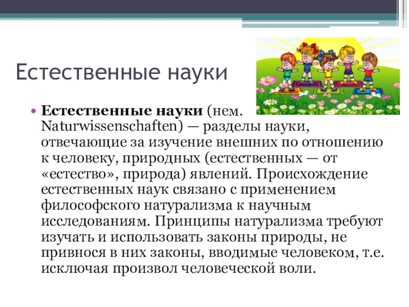 по отношению к человеку, природных (естественных — от «естество», природа) явлений. Происхождение естественных наук связано с применением философского натурализма к научным исследованиям. Принципы натурализма требуют изучать и использовать законы природы, не привнося в них законы, вводимые человеком, т.е. исключая произвол человеческой воли.