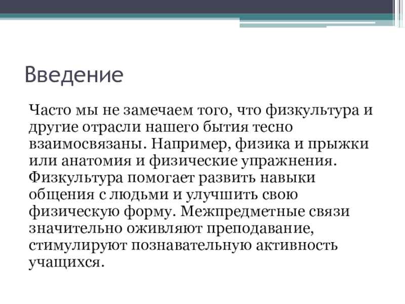 бытия тесно взаимосвязаны. Например, физика и прыжки или анатомия и физические упражнения. Физкультура помогает развить навыки общения с людьми и улучшить свою физическую форму. Межпредметные связи значительно оживляют преподавание, стимулируют познавательную активность учащихся.