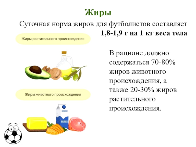 В рационе должно содержаться 70-80% жиров животного происхождения, а также 20-30% жиров растительного происхождения.