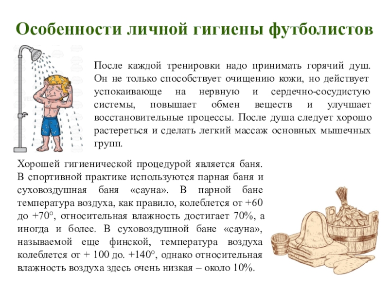 После каждой тренировки надо принимать горячий душ. Он не только способствует очищению кожи, но действует успокаивающе на нервную и сердечно-сосудистую системы, повышает обмен веществ и улучшает восстановительные процессы. После душа следует хорошо растереться и сделать легкий массаж основных мышечных групп.