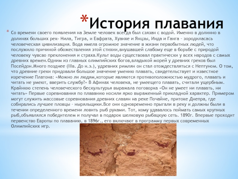 сзязан с водой. Именно в долинно в долинах больших рек- Нила, Тигра, и Евфрата, Хуанхе и Янцзы, Инда и Ганга – зородиласась человеческая цивилизация. Вода имела огромное значение в жизни первобытных людей, что послужило причиной обожествления этой стихии,внушавшей слабому еще в борьбе с природой человеку чувсво преклонения и страха.Культ воды существовал практически у всех народов с самых древних времен.Одним из главных олимпийских богов,владыкой морей у древних греков был Посейдон.Много позднее (IIIв. До н.э.), удревних римлян он стал отождествляться с Нептуном. О том, что древние греки придовали большое значение умению плавать, свидетельствует и известное изречение Платона: «Можно ли людям,которые являются противоположностью мудрого, плавать и читать не умеют, вверить службу?» В Афинах человека, не умеещего плавать, считали ущербным. Крайнюю степень человеческого бескультурья выражала поговорка «Он не умеет ни плавать, ни читать» Первые соревнования по плаванию носили ярко выраженный прикладной характер. Примером могут служить массовые соревнования древних славян на реке Почайне, притоке Днепра, где собирались лучшее пловцы – ныряльщики.Все они одновременно прыгали в реку и должны были в течении определенного времени ловить рыб руками. Тот, кому удавалось поймать самых крупных рыб,объявлялся победителем и получал в подарок шелковую рыбацкую сеть. 1890г. Впервые проходит первенство Европы по плаванию, в 1896г., его включают в программу первых современных Олимпийских игр.