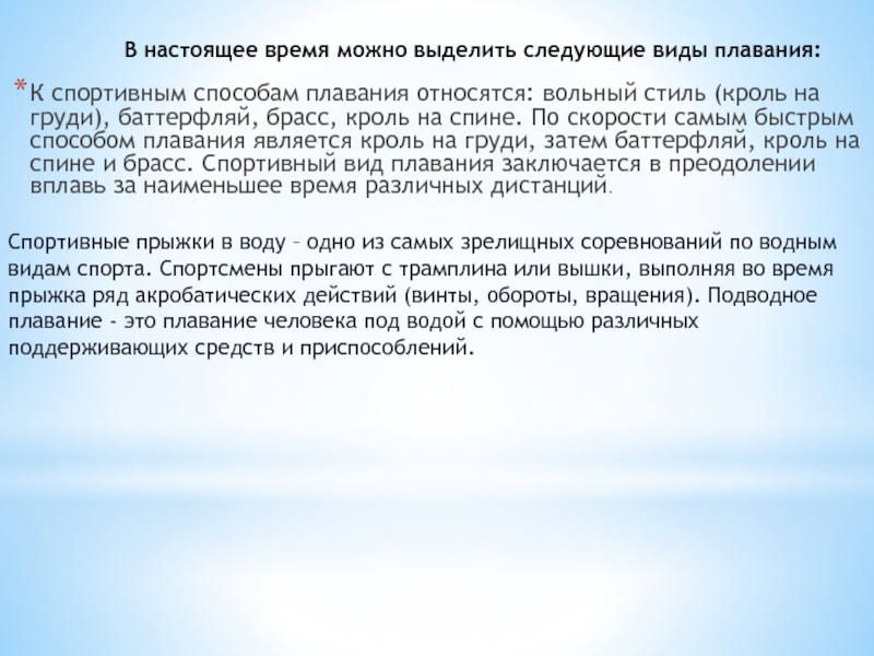 Слайд 8В настоящее время можно выделить следующие виды плавания: