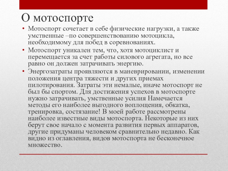 Энергозатраты проявляются в маневрировании, изменении положения центра тяжести и других приемах пилотирования. Затраты эти немалые, иначе мотоспорт не был бы спортом. Для достижения успехов в мотоспорте нужно затрачивать, умственные усилия Намечается методы его наиболее выгодного воплощения, обкатка, тренировка, состязание! В моей работе рассмотрены наиболее известные виды мотоспорта. Некоторые из них берут свое начало с момента развития первых аппаратов, другие придуманы человеком сравнительно недавно. Как видно из оглавления, видов мотоспорта не бесконечное множество.