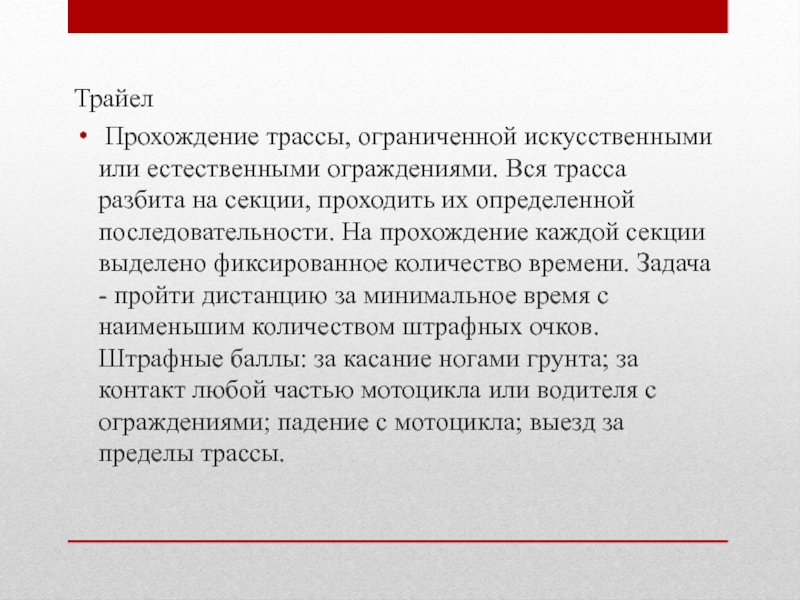 на секции, проходить их определенной последовательности. На прохождение каждой секции выделено фиксированное количество времени. Задача - пройти дистанцию за минимальное время с наименьшим количеством штрафных очков. Штрафные баллы: за касание ногами грунта; за контакт любой частью мотоцикла или водителя с ограждениями; падение с мотоцикла; выезд за пределы трассы.