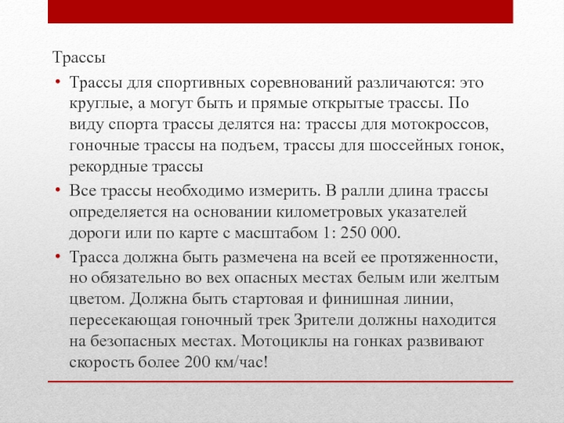 и прямые открытые трассы. По виду спорта трассы делятся на: трассы для мотокроссов, гоночные трассы на подъем, трассы для шоссейных гонок, рекордные трассы