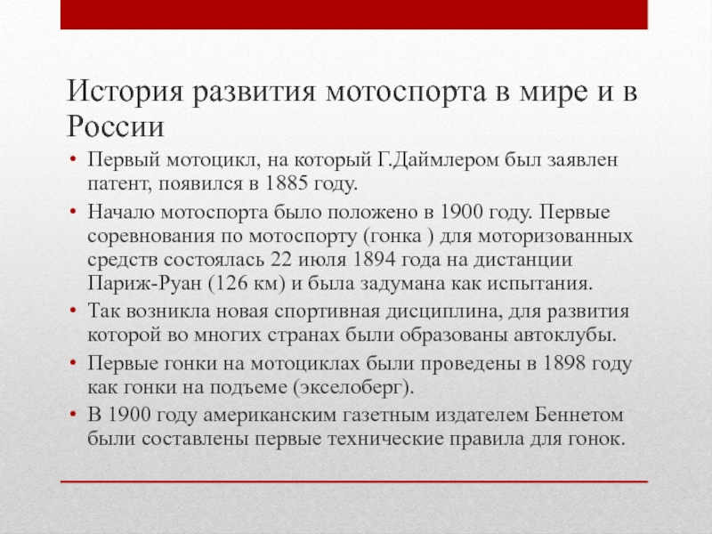 Слайд 5История развития мотоспорта в мире и в России