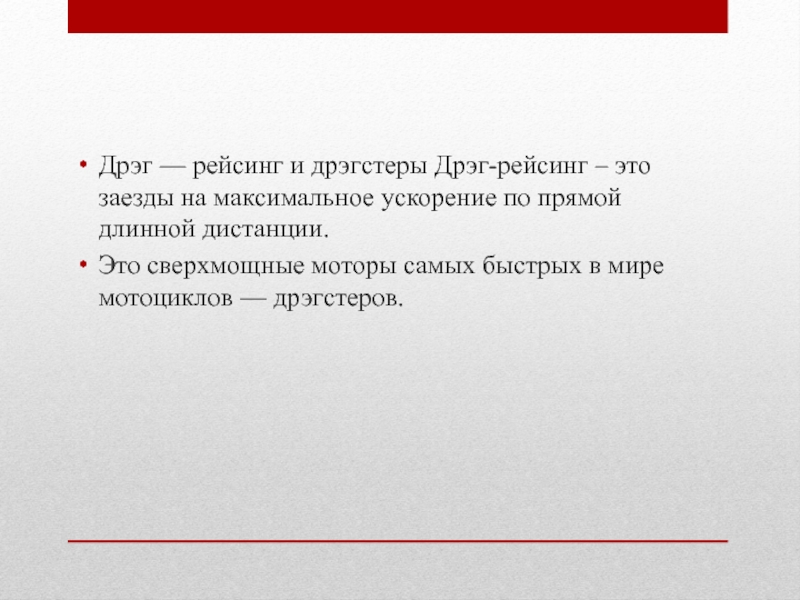 Слайд 21Дрэг — рейсинг и дрэгстеры Дрэг-рейсинг – это заезды на максимальное