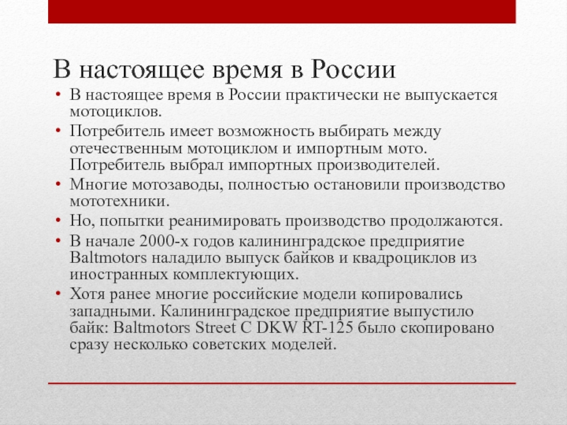 Хотя ранее многие российские модели копировались западными. Калининградское предприятие выпустило байк: Baltmotors Street С DKW RT-125 было скопировано сразу несколько советских моделей.
