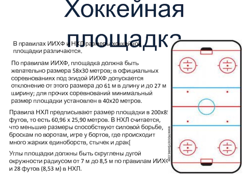 Правила НХЛ предписывают размер площадки в 200х85 футов, то есть 60,96 х 25,90 метров. В НХЛ считается, что меньшие размеры способствуют силовой борьбе, броскам по воротам, игре у бортов, где происходит много жарких единоборств, стычек и драк[