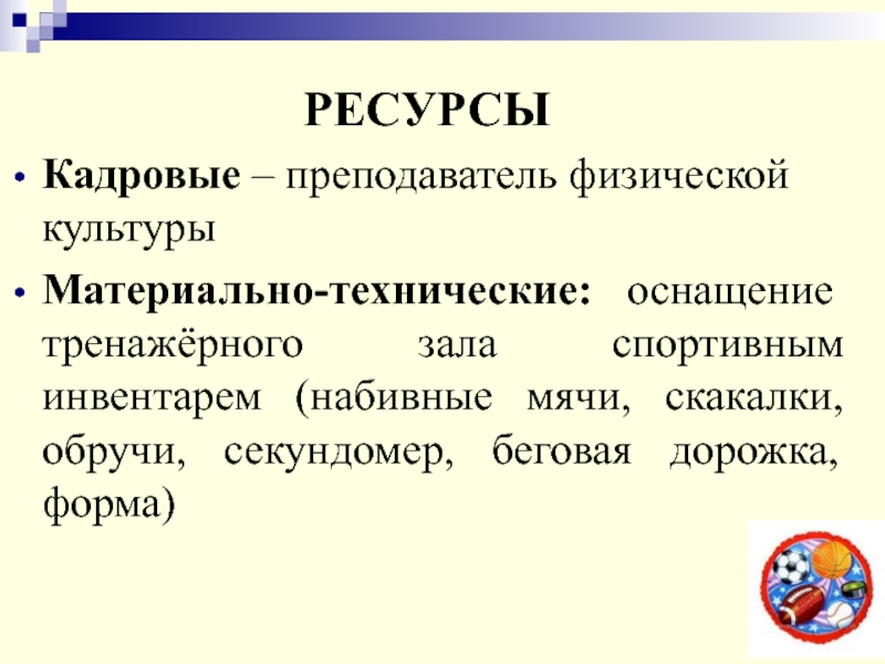 Материально-технические: оснащение тренажёрного зала спортивным инвентарем (набивные