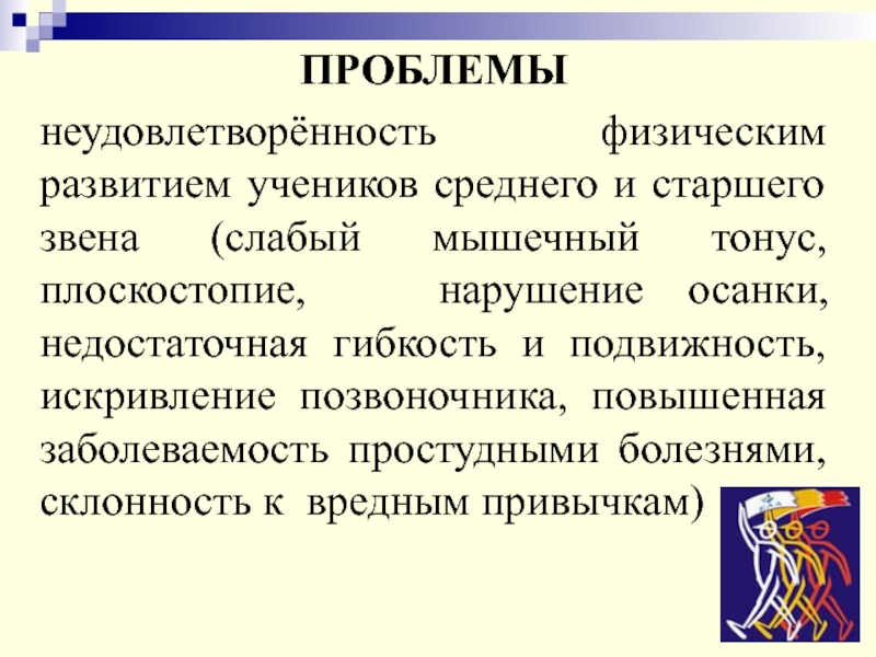 тонус, плоскостопие, нарушение осанки, недостаточная гибкость и подвижность, искривление позвоночника, повышенная заболеваемость простудными болезнями, склонность к вредным привычкам)