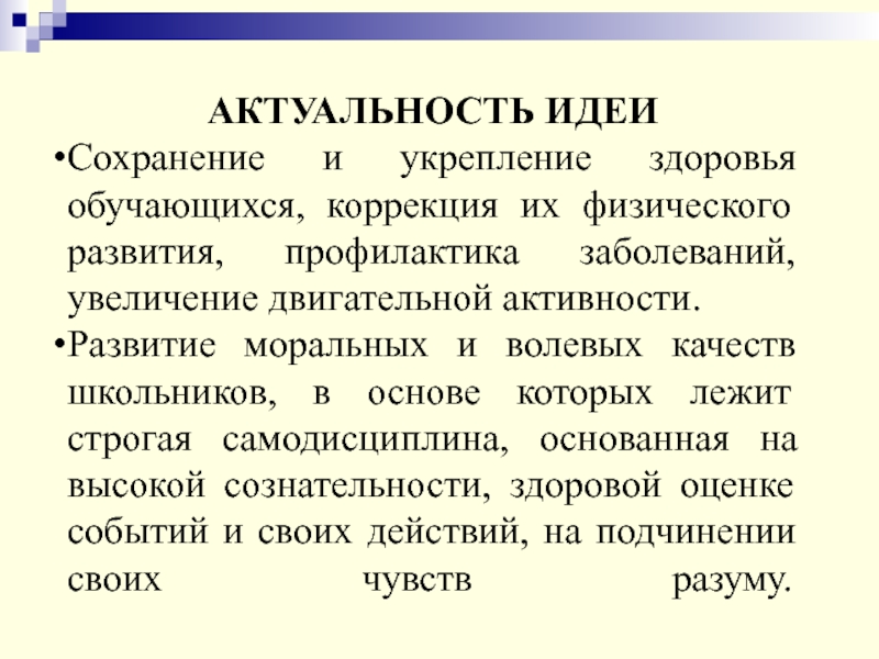 Развитие моральных и волевых качеств школьников, в основе которых лежит строгая самодисциплина, основанная на высокой сознательности, здоровой оценке событий и своих действий, на подчинении своих чувств разуму.