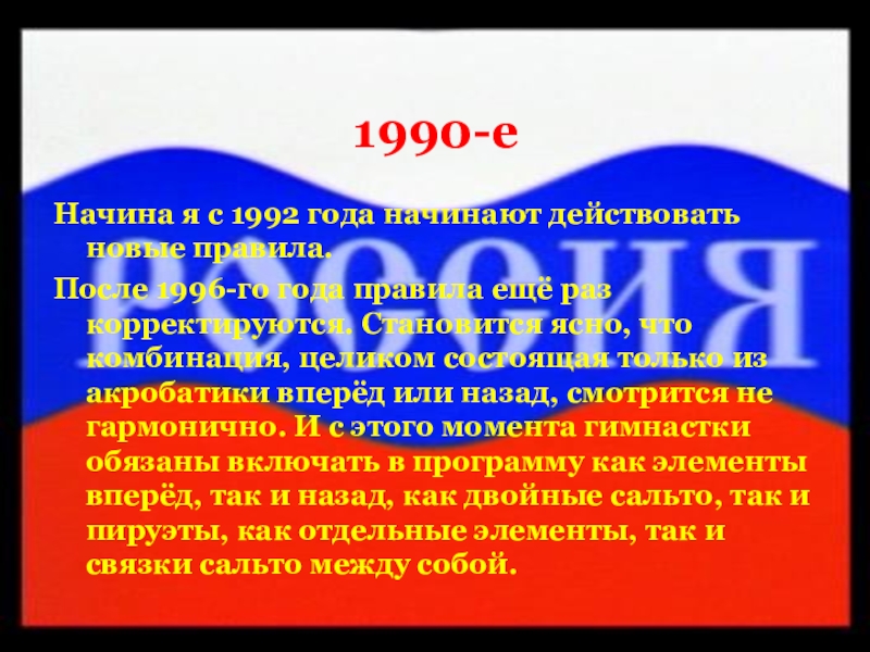 правила ещё раз корректируются. Становится ясно, что комбинация, целиком состоящая только из акробатики вперёд или назад, смотрится не гармонично. И с этого момента гимнастки обязаны включать в программу как элементы вперёд, так и назад, как двойные сальто, так и пируэты, как отдельные элементы, так и связки сальто между собой.