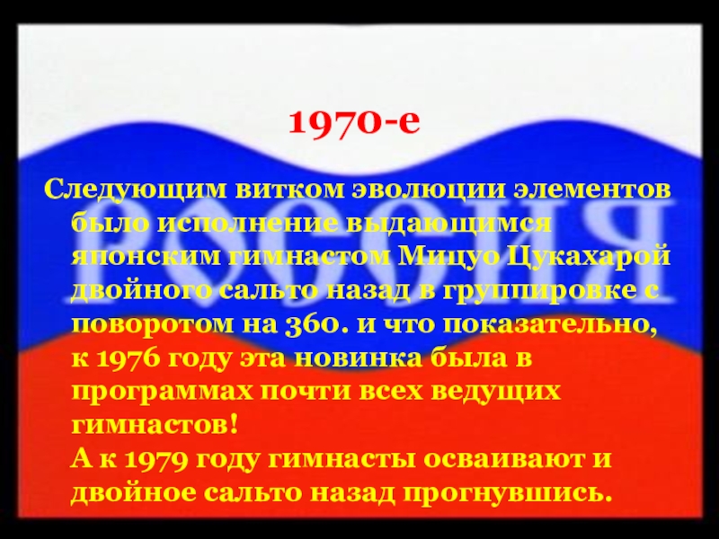 А к 1979 году гимнасты осваивают и двойное сальто назад прогнувшись.