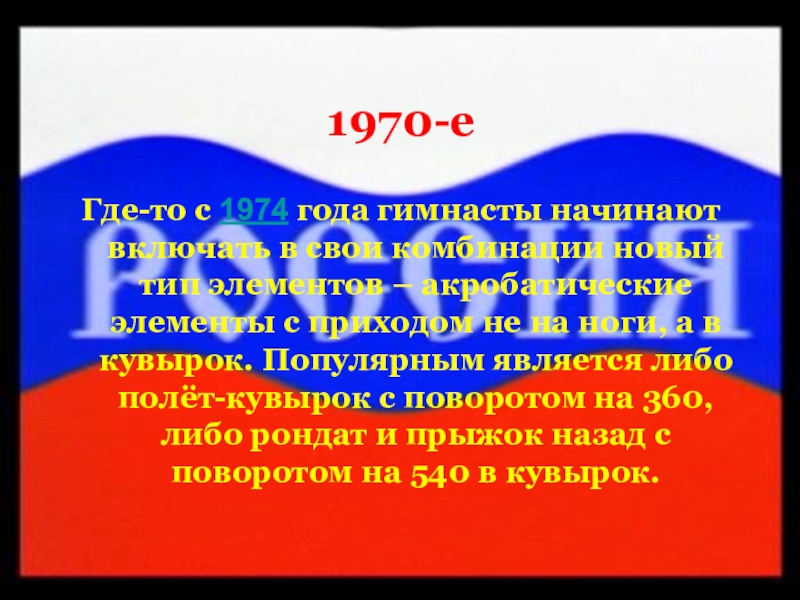 Где-то с 1974 года гимнасты начинают включать в свои комбинации новый тип элементов