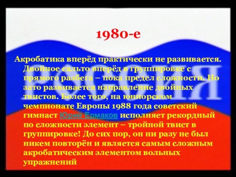 прямого разбега – пока предел сложности. Но зато развивается направление двойных твистов. Более того, на юниорском чемпионате Европы 1988 года советский гимнаст Юрий Ермаков исполняет рекордный по сложности элемент – тройной твист в группировке! До сих пор, он ни разу не был никем повторён и является самым сложным акробатическим элементом вольных упражнений