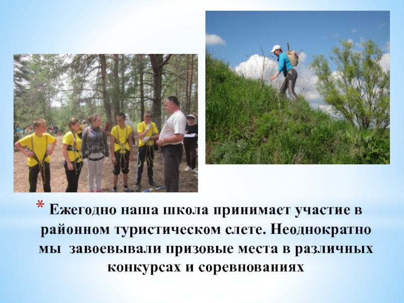 Слайд 15Ежегодно наша школа принимает участие в районном туристическом слете. Неоднократно мы