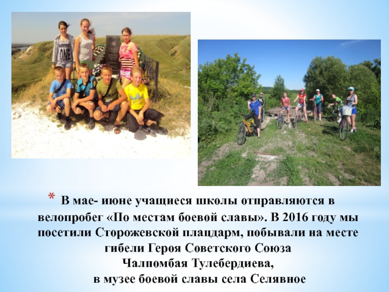 славы». В 2016 году мы посетили Сторожевской плацдарм, побывали на месте гибели Героя Советского Союза Чалпомбая Тулебердиева, в музее боевой славы села Селявное