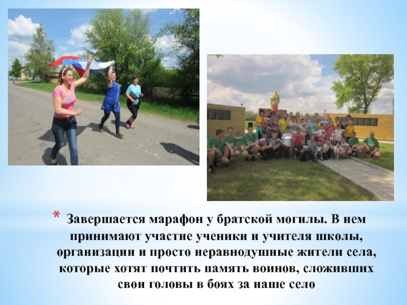Слайд 12Завершается марафон у братской могилы. В нем принимают участие ученики и