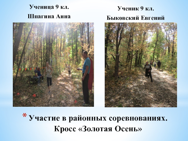 Ученица 9 кл. Шпагина АннаУченик 9 кл. Быковский ЕвгенийУчастие в районных соревнованиях.  Кросс «Золотая Осень»