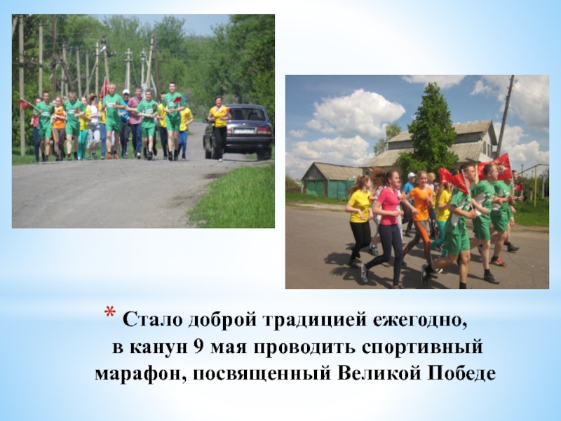 Слайд 11Стало доброй традицией ежегодно, в канун 9 мая проводить спортивный марафон,