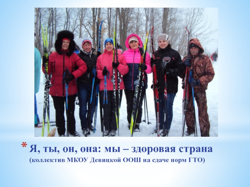 Слайд 2Я, ты, он, она: мы – здоровая страна (коллектив МКОУ Девицкой
