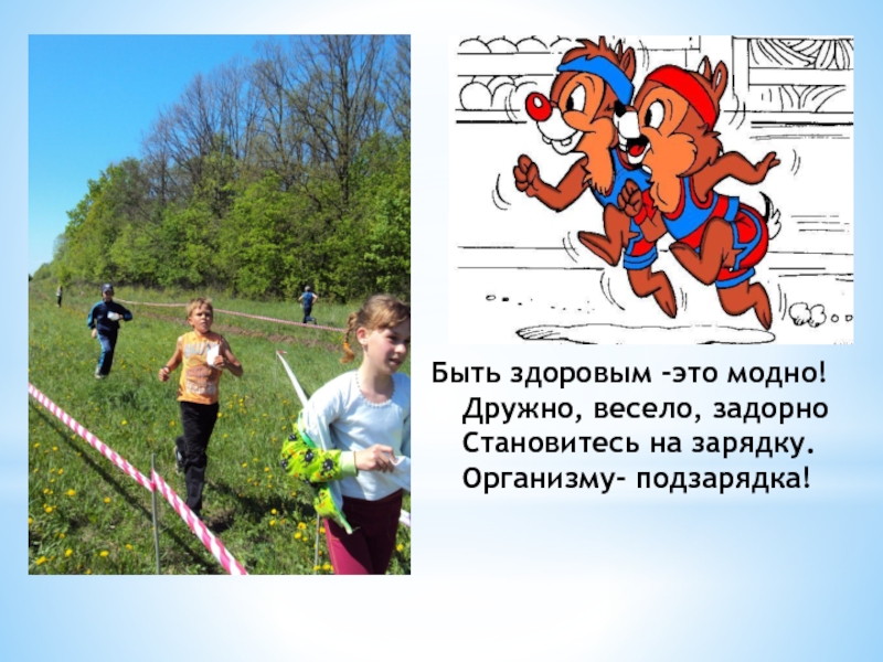 Быть здоровым -это модно! Дружно, весело, задорно Становитесь на зарядку. Организму- подзарядка!