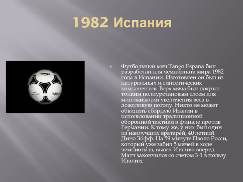 года в Испании. Изготовлен он был из натуральных и синтетических компонентов. Верх мяча был покрыт тонким полиуретановым слоем для минимизации увеличения веса в дождливую погоду. Никто не может обвинить сборную Италии в использовании традиционной оборонной тактики в финале против Германии. К тому же, у них был один из наилучших вратарей, 40 летний Дино Зофф. На 59 минуте Паоло Росси, который уже забил 5 мячей в ходе чемпионата, вывел Италию вперед. Матч закончился со счетом 3-1 в пользу Италии.