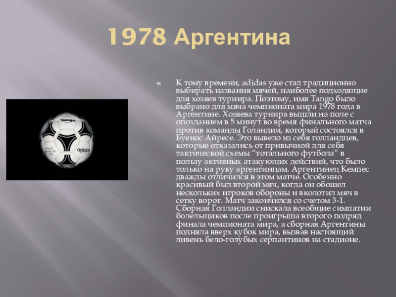 наиболее подходящие для хозяев турнира. Поэтому, имя Tango было выбрано для мяча чемпионата мира 1978 года в Аргентине. Хозяева турнира вышли на поле с опозданием в 5 минут во время финального матча против команды Голандии, который состоялся в Буенос Айресе. Это вывело из себя голландцев, которые отказались от привычной для себя тактической схемы “тотального футбола” в пользу активных атакующих действий, что было только на руку аргентинцам. Аргентинец Кемпес дважды отличился в этом матче. Особенно красивый был второй мяч, когда он обошел нескольких игроков обороны и вколотил мяч в сетку ворот. Матч закончился со счетом 3-1. Сборная Голландии снискала всеобщие симпатии болельщиков после проигрыша второго подряд финала чемпионата мира, а сборная Аргентины подняла вверх кубок мира, вызвав настоящий ливень бело-голубых серпантинов на стадионе.