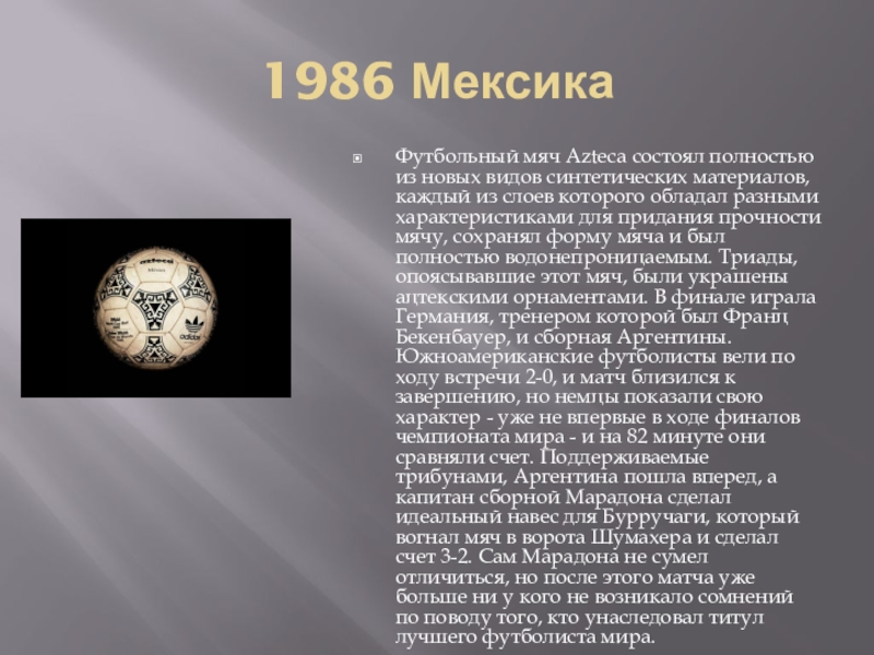 материалов, каждый из слоев которого обладал разными характеристиками для придания прочности мячу, сохранял форму мяча и был полностью водонепроницаемым. Триады, опоясывавшие этот мяч, были украшены ацтекскими орнаментами. В финале играла Германия, тренером которой был Франц Бекенбауер, и сборная Аргентины. Южноамериканские футболисты вели по ходу встречи 2-0, и матч близился к завершению, но немцы показали свою характер - уже не впервые в ходе финалов чемпионата мира - и на 82 минуте они сравняли счет. Поддерживаемые трибунами, Аргентина пошла вперед, а капитан сборной Марадона сделал идеальный навес для Бурручаги, который вогнал мяч в ворота Шумахера и сделал счет 3-2. Сам Марадона не сумел отличиться, но после этого матча уже больше ни у кого не возникало сомнений по поводу того, кто унаследовал титул лучшего футболиста мира.