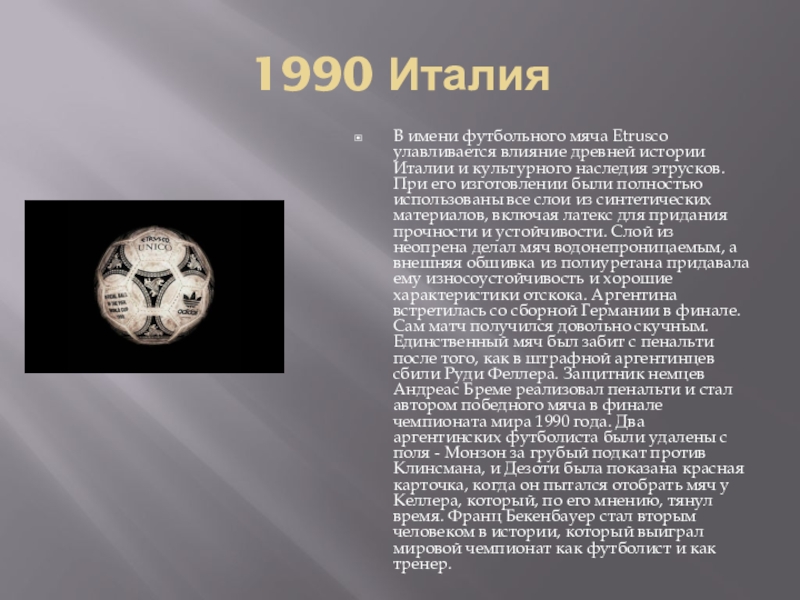 и культурного наследия этрусков. При его изготовлении были полностью использованы все слои из синтетических материалов, включая латекс для придания прочности и устойчивости. Слой из неопрена делал мяч водонепроницаемым, а внешняя обшивка из полиуретана придавала ему износоустойчивость и хорошие характеристики отскока. Аргентина встретилась со сборной Германии в финале. Сам матч получился довольно скучным. Единственный мяч был забит с пенальти после того, как в штрафной аргентинцев сбили Руди Феллера. Защитник немцев Андреас Бреме реализовал пенальти и стал автором победного мяча в финале чемпионата мира 1990 года. Два аргентинских футболиста были удалены с поля - Монзон за грубый подкат против Клинсмана, и Дезоти была показана красная карточка, когда он пытался отобрать мяч у Келлера, который, по его мнению, тянул время. Франц Бекенбауер стал вторым человеком в истории, который выиграл мировой чемпионат как футболист и как тренер.