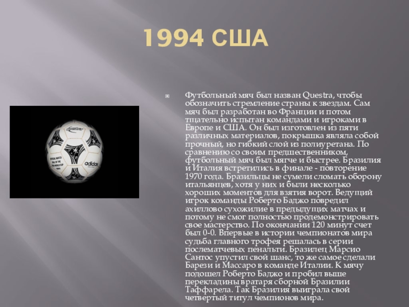 звездам. Сам мяч был разработан во Франции и потом тщательно испытан командами и игроками в Европе и США. Он был изготовлен из пяти различных материалов, покрышка являла собой прочный, но гибкий слой из полиуретана. По сравнению со своим предшественником, футбольный мяч был мягче и быстрее. Бразилия и Италия встретились в финале - повторение 1970 года. Бразильцы не сумели сломать оборону итальянцев, хотя у них и были несколько хороших моментов для взятия ворот. Ведущий игрок команды Роберто Баджо повредил ахиллово сухожилие в предыдущих матчах и потому не смог полностью продемонстрировать свое мастерство. По окончании 120 минут счет был 0-0. Впервые в истории чемпионатов мира судьба главного трофея решалась в серии послематчевых пенальти. Бразилец Марсио Сантос упустил свой шанс, то же самое сделали Барези и Массаро в команде Италии. К мячу подошел Роберто Баджо и пробил выше перекладины вратаря сборной Бразилии Таффарела. Так Бразилия выиграла свой четвертый титул чемпионов мира.
