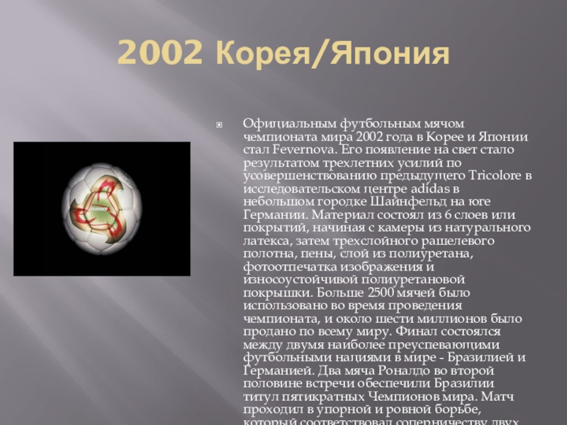 Японии стал Fevernova. Его появление на свет стало результатом трехлетних усилий по усовершенствованию предыдущего Tricolore в исследовательском центре adidas в небольшом городке Шайнфельд на юге Германии. Материал состоял из 6 слоев или покрытий, начиная с камеры из натурального латекса, затем трехслойного рашелевого полотна, пены, слой из полиуретана, фотоотпечатка изображения и износоустойчивой полиуретановой покрышки. Больше 2500 мячей было использовано во время проведения чемпионата, и около шести миллионов было продано по всему миру. Финал состоялся между двумя наиболее преуспевающими футбольными нациями в мире - Бразилией и Германией. Два мяча Роналдо во второй половине встречи обеспечили Бразилии титул пятикратных Чемпионов мира. Матч проходил в упорной и ровной борьбе, который соответствовал соперничеству двух футбольных титанов, но два точных удара Роналдо определили победителя этой встречи в Йокогаме (Япония).