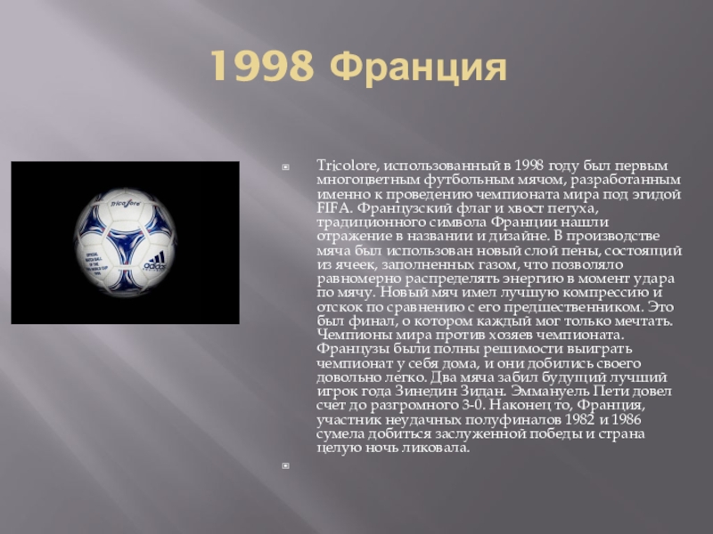 разработанным именно к проведению чемпионата мира под эгидой FIFA. Французский флаг и хвост петуха, традиционного символа Франции нашли отражение в названии и дизайне. В производстве мяча был использован новый слой пены, состоящий из ячеек, заполненных газом, что позволяло равномерно распределять энергию в момент удара по мячу. Новый мяч имел лучшую компрессию и отскок по сравнению с его предшественником. Это был финал, о котором каждый мог только мечтать. Чемпионы мира против хозяев чемпионата. Французы были полны решимости выиграть чемпионат у себя дома, и они добились своего довольно легко. Два мяча забил будущий лучший игрок года Зинедин Зидан. Эммануель Пети довел счет до разгромного 3-0. Наконец то, Франция, участник неудачных полуфиналов 1982 и 1986 сумела добиться заслуженной победы и страна целую ночь ликовала.