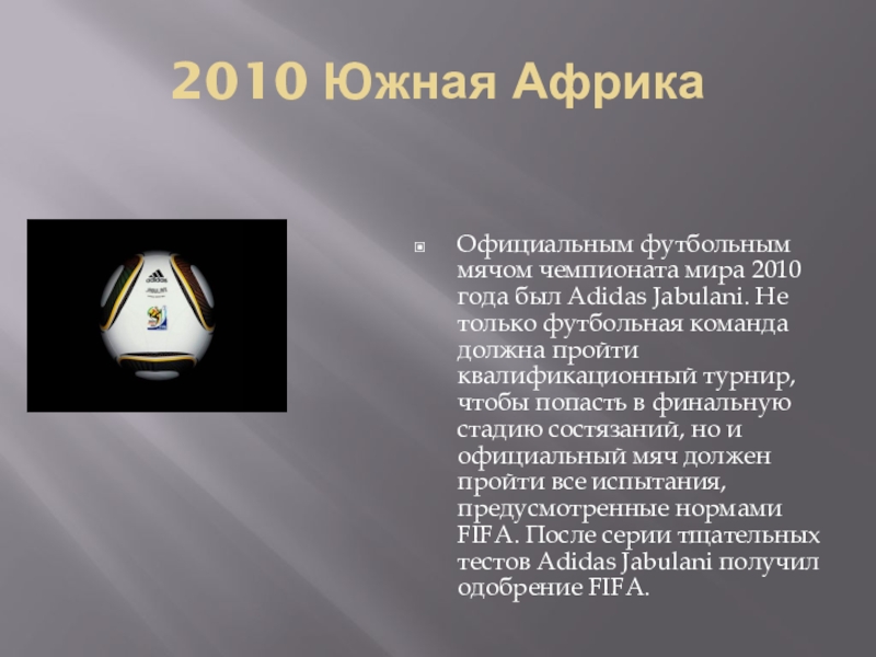 Jabulani. Не только футбольная команда должна пройти квалификационный турнир, чтобы попасть в финальную стадию состязаний, но и официальный мяч должен пройти все испытания, предусмотренные нормами FIFA. После серии тщательных тестов Adidas Jabulani получил одобрение FIFA.