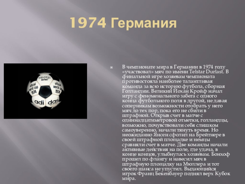 В чемпионате мира в Германии в 1974 году «участвовал» мяч