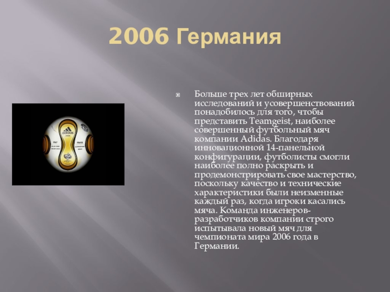 чтобы представить Teamgeist, наиболее совершенный футбольный мяч компании Adidas. Благодаря инновационной 14-панельной конфигурации, футболисты смогли наиболее полно раскрыть и продемонстрировать свое мастерство, поскольку качество и технические характеристики были неизменные каждый раз, когда игроки касались мяча. Команда инженеров-разработчиков компании строго испытывала новый мяч для чемпионата мира 2006 года в Германии.