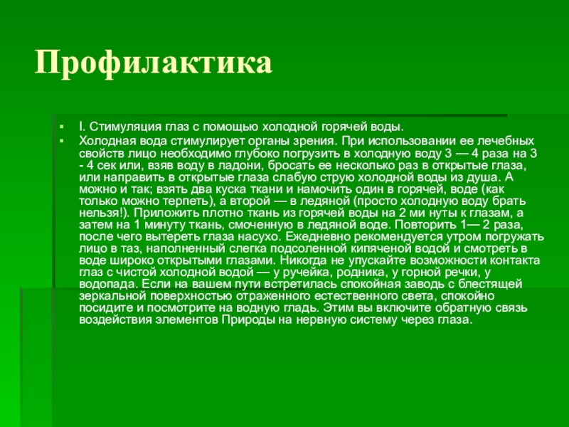 зрения. При использовании ее лечебных свойств лицо необходимо глубоко погрузить в холодную воду 3 — 4 раза на 3 - 4 сек или, взяв воду в ладони, бросать ее несколько раз в открытые глаза, или направить в открытые глаза слабую струю холодной воды из душа. А можно и так; взять два куска ткани и намочить один в горячей, воде (как только можно терпеть), а второй — в ледяной (просто холодную воду брать нельзя!). Приложить плотно ткань из горячей воды на 2 ми нуты к глазам, а затем на 1 минуту ткань, смоченную в ледяной воде. Повторить 1— 2 раза, после чего вытереть глаза насухо. Ежедневно рекомендуется утром погружать лицо в таз, наполненный слегка подсоленной кипяченой водой и смотреть в воде широко открытыми глазами. Никогда не упускайте возможности контакта глаз с чистой холодной водой — у ручейка, родника, у горной речки, у водопада. Если на вашем пути встретилась спокойная заводь с блестящей зеркальной поверхностью отраженного естественного света, спокойно посидите и посмотрите на водную гладь. Этим вы включите обратную связь воздействия элементов Природы на нервную систему через глаза.