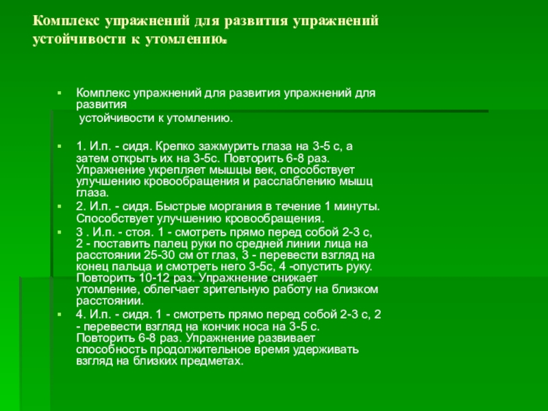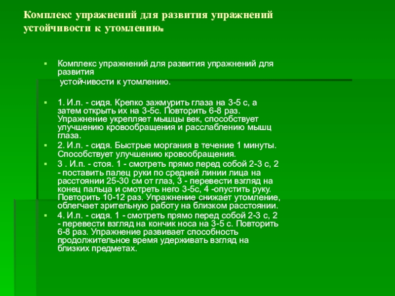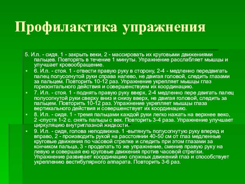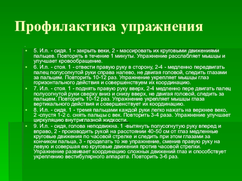 3 . И.п. - стоя. 1 - смотреть прямо перед собой 2-3 с, 2 - поставить палец руки по средней линии лица на расстоянии 25-30 см от глаз, 3 - перевести взгляд на конец пальца и смотреть него 3-5с, 4 -опустить руку. Повторить 10-12 раз. Упражнение снижает утомление, облегчает зрительную работу на близком расстоянии.