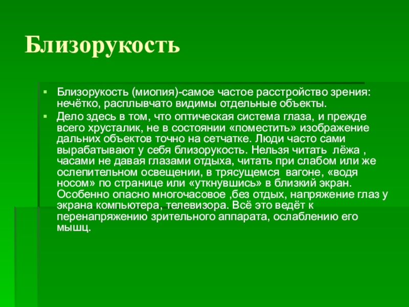в том, что оптическая система глаза, и прежде всего хрусталик, не в состоянии «поместить» изображение дальних объектов точно на сетчатке. Люди часто сами вырабатывают у себя близорукость. Нельзя читать лёжа ,часами не давая глазами отдыха, читать при слабом или же ослепительном освещении, в трясущемся вагоне, «водя носом» по странице или «уткнувшись» в близкий экран. Особенно опасно многочасовое ,без отдых, напряжение глаз у экрана компьютера, телевизора. Всё это ведёт к перенапряжению зрительного аппарата, ослаблению его мышц.