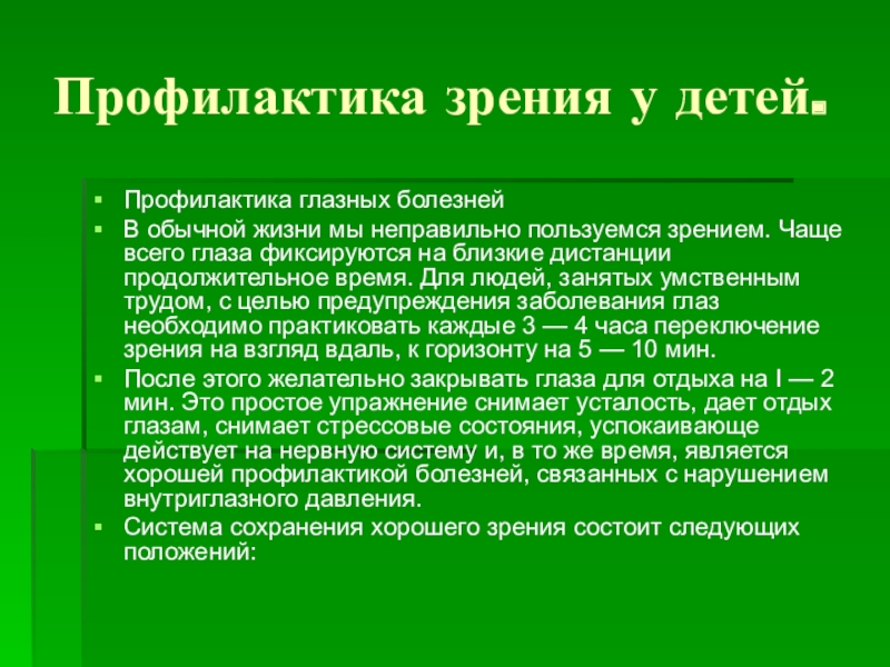 зрением. Чаще всего глаза фиксируются на близкие дистанции продолжительное время. Для людей, занятых умственным трудом, с целью предупреждения заболевания глаз необходимо практиковать каждые 3 — 4 часа переключение зрения на взгляд вдаль, к горизонту на 5 — 10 мин.